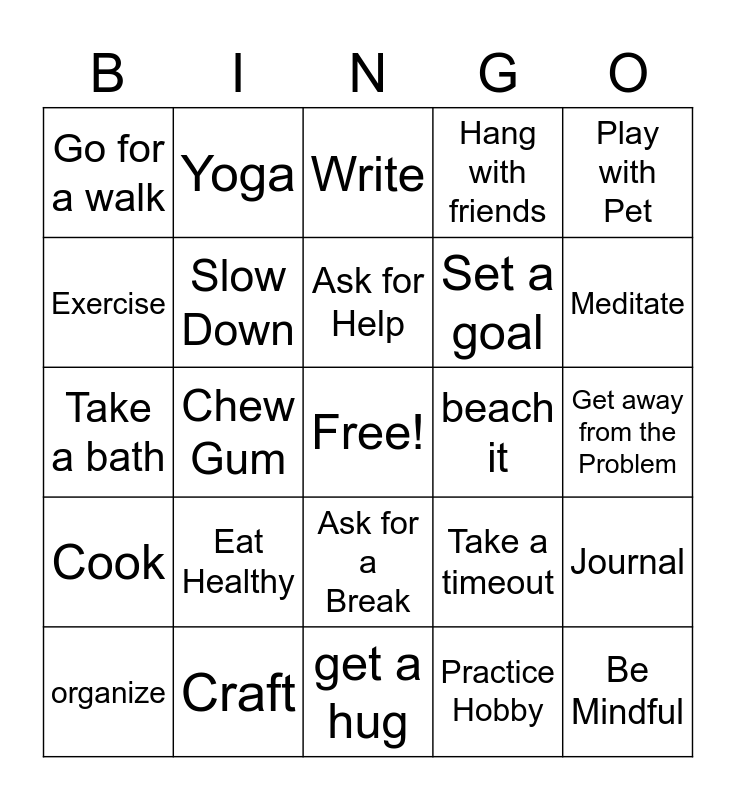This bingo card has a free space and 79 words: Listen to Music, Talk to Someone, Write, Take 10 deep breaths, Watch a movie, Use a stress ball, Clean, Read, Drink Water, Say positive Affirmations, Paint or draw, Go outside, Hang with friends, Go for a walk, Laugh, Exercise, bake, Eat Healthy, Dance, Get away from the Problem, Get a snack, Play with Pet, Take a bath, Ask for Help, Slow Down, Unplug, Relax, Enjoy Life, Have Fun, Smile, Meditate, Be positive, get a hug, give a hug, organize, beach it, Fish, Sail, Surf, Be Mindful, Breath, Talk it Out, Run, Sing, Play a game, Yoga, Do a Puzzle, Doodle, Color, Watch TV, Journal, Chew Gum, Take a timeout, paint your nails, Use a relaxation App, Say "I got this", Drink some tea, Drink some hot choc, Take a shower, Ask for a Break, Set a goal, Tell a joke, Build something, Think of something funny, Garden, Count to 10, Count to 100, Keep Positive, Stretch, Cook, Craft, Vent to someone, Face time someone, Text a friend, Video game, Practice Hobby, Practice favorite sport, Watch a sport and Call a friend.