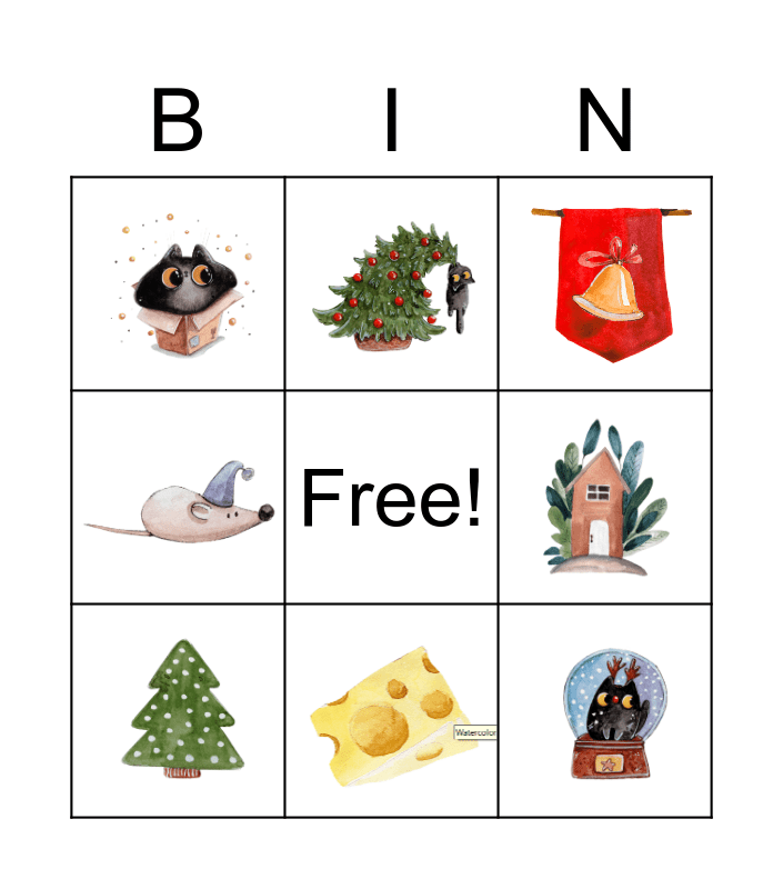 This bingo card has 15 images and a free space.