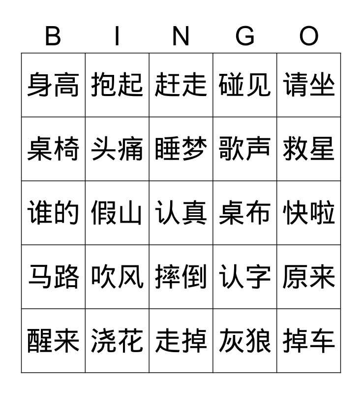 This bingo card has a free space and 24 words: 吹风, 浇花, 睡梦, 醒来, 请坐, 身高, 桌椅, 抱起, 桌布, 摔倒, 歌声, 谁的, 认字, 原来, 头痛, 灰狼, 快啦, 赶走, 救星, 假山, 掉车, 马路, 碰见 and 走掉.