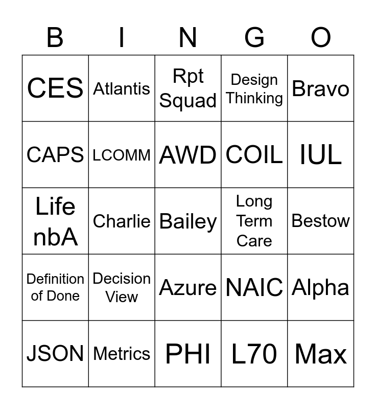 This bingo card has a free space and 63 words: Free!, AEGIS, Agile, Alpha, Andesa, API, Atlantis, Automation, AWD, AWS, Azure, Backlog Health, Bestow, Bravo, Cap Gemini, CAPS, Charlie, CES, Cloud, COIL, Decision View, Definition of Done, Design Thinking, Digital UW, Discovery, DPC, DST, DXC, Easy Under Writing, eDelivery, ESP, Farmers, ICC, Illustrations, IUL, JSON, Kanban, L70, LATTE, LCOMM, Life nbA, Long Term Care, Low Code, Magnum, Max, Metrics, Nationwide, NAIC, NIGO, OKR, Paper Clip, PHI, PPFL, Proposals, Reg BI, Rpt Squad, RVUL, SmartFix, TCS, Term-in-10, Unqork, VUL and xPression.