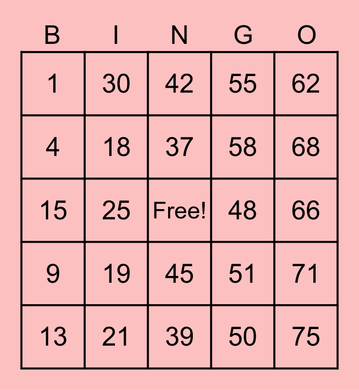 This bingo card has a free space and 24 words: 13, 19, 37, 50, 62, 1, 30, 42, 48, 66, 15, 18, 51, 71, 4, 21, 39, 55, 68, 9, 25, 45, 58 and 75.