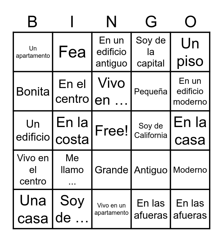 This bingo card has a free space and 24 words: Me llamo ..., Soy de …, Vivo en …, Una casa, Un piso, Un apartamento, Bonita, Fea, Soy de California, Grande, Pequeña, Un edificio, Antiguo, Moderno, En el centro, En las afueras, En la casa, En un edificio antiguo, En un edificio moderno, En la costa, En las afueras, Vivo en el centro, Soy de la capital and Vivo en un apartamento.