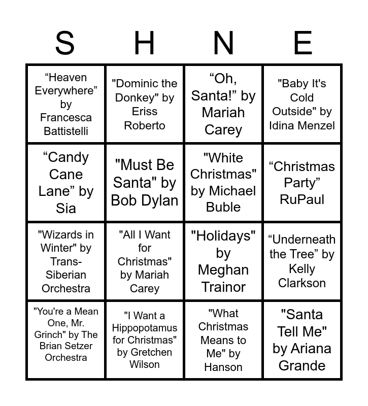 This bingo card has 18 words: "All I Want for Christmas" by Mariah Carey, "Santa Tell Me" by Ariana Grande, “Oh, Santa!” by Mariah Carey, “Heaven Everywhere” by Francesca Battistelli, "Holidays" by Meghan Trainor, "Baby It's Cold Outside" by Idina Menzel, "You're a Mean One, Mr. Grinch" by The Brian Setzer Orchestra, "Dominic the Donkey" by Eriss Roberto, “Christmas Party” RuPaul, "Wizards in Winter" by Trans-Siberian Orchestra, "What Christmas Means to Me" by Hanson, “Candy Cane Lane” by Sia, “Underneath the Tree” by Kelly Clarkson, "Must Be Santa" by Bob Dylan, "White Christmas" by Michael Buble, “Stretchy Pants” by Carrie Underwood, "I Want a Hippopotamus for Christmas" by Gretchen Wilson and “Bells, Bows, Gifts, Trees” by Todrick Hall.