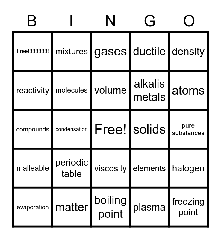 This bingo card has a free space and 24 words: periodic table, matter, volume, evaporation, density, Free!!!!!!!!!!!!!!, reactivity, mixtures, solids, viscosity, alkalis metals, compounds, elements, halogen, molecules, plasma, pure substances, gases, atoms, condensation, freezing point, malleable, ductile and boiling point.