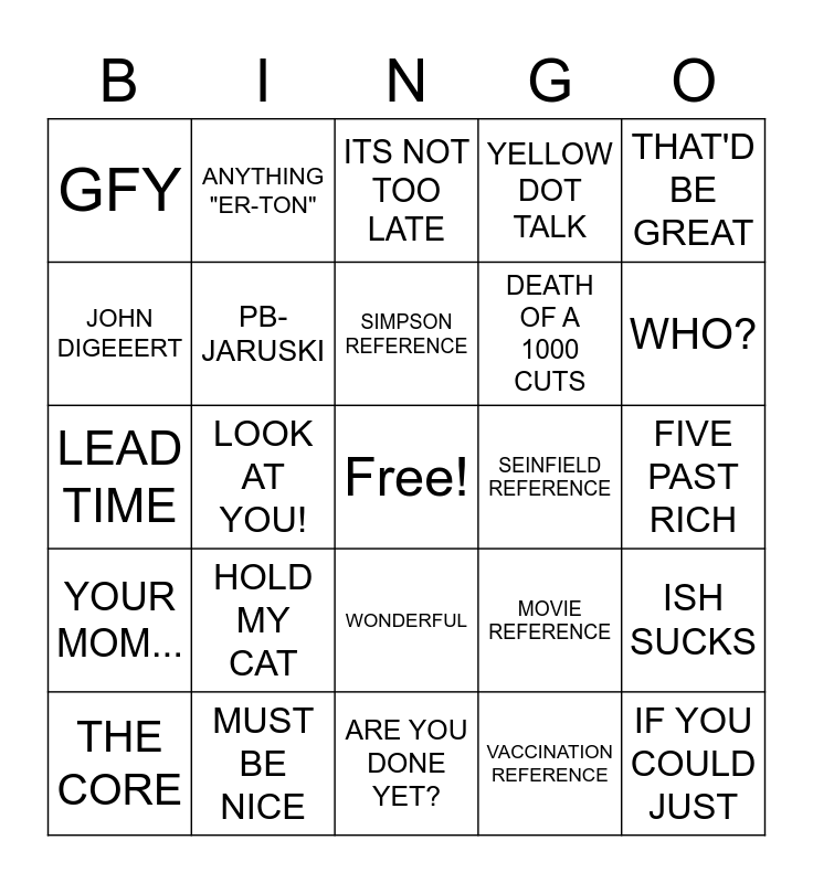 This bingo card has a free space and 24 words: HOLD MY CAT, MUST BE NICE, SIMPSON REFERENCE, THE CORE, THAT'D BE GREAT, GFY, JOHN DIGEEERT, ANYTHING "ER-TON", SEINFIELD REFERENCE, WONDERFUL, DEATH OF A 1000 CUTS, LEAD TIME, MOVIE REFERENCE, ISH SUCKS, PB-JARUSKI, VACCINATION REFERENCE, FIVE PAST RICH, ITS NOT TOO LATE, WHO?, LOOK AT YOU!, IF YOU COULD JUST, YOUR MOM..., YELLOW DOT TALK and ARE YOU DONE YET?.