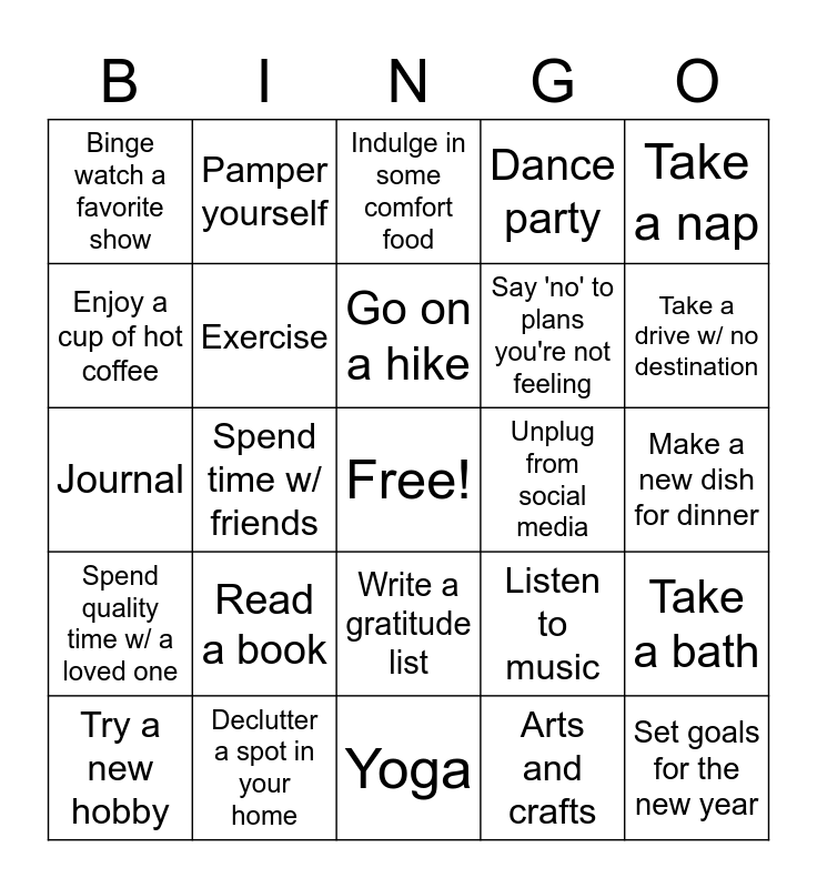 This bingo card has a free space and 24 words: Read a book, Declutter a spot in your home, Go on a hike, Try a new hobby, Take a nap, Binge watch a favorite show, Enjoy a cup of hot coffee, Pamper yourself, Unplug from social media, Write a gratitude list, Say 'no' to plans you're not feeling, Journal, Listen to music, Take a bath, Exercise, Arts and crafts, Make a new dish for dinner, Indulge in some comfort food, Take a drive w/ no destination, Spend time w/ friends, Set goals for the new year, Spend quality time w/ a loved one, Dance party and Yoga.