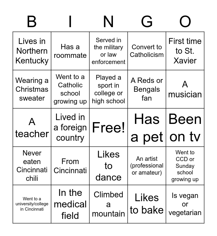 This bingo card has a free space and 24 words: From Cincinnati, In the medical field, Played a sport in college or high school, Went to a university/college in Cincinnati, First time to St. Xavier, Lives in Northern Kentucky, Wearing a Christmas sweater, Has a roommate, Has a pet, Likes to dance, A Reds or Bengals fan, A teacher, An artist (professional or amateur), Went to CCD or Sunday school growing up, Went to a Catholic school growing up, Likes to bake, Been on tv, Served in the military or law enforcement, A musician, Lived in a foreign country, Is vegan or vegetarian, Never eaten Cincinnati chili, Convert to Catholicism and Climbed a mountain.