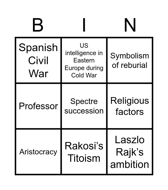 This bingo card has 9 words: Aristocracy, Spectre succession, Symbolism of reburial, Spanish Civil War, US intelligence in Eastern Europe during Cold War, Religious factors, Professor, Rakosi’s Titoism and Laszlo Rajk’s ambition.