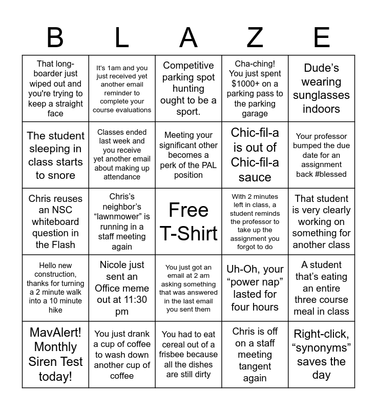 This bingo card has a free space and 64 words: A student is wearing what is obviously a set of pajamas, That student is playing League of Legends in class and thinks no one notices, Someone’s watching Netflix behind you and giggling, A student that’s eating an entire three course meal in class, Party Foul: Someone spilled their water bottle on their desk, Ding! You just received a smartwatch notification to “breathe”, It’s 1am and you just received yet another email reminder to complete your course evaluations, The woman sitting in front of you just flipped her hair and hit you in the face, Meeting your significant other becomes a perk of the PAL position, Someone stole the answer you were going to put on the NSC whiteboard, You just got an email at 2 am asking something that was answered in the last email you sent them, You’ve tried every way to plug in your USB, yet its always the wrong way, That student is very clearly working on something for another class, Dude’s wearing sunglasses indoors, You realize you have one class in Pickard and the next class in the Social Work building, The student sleeping in class starts to snore, Chris’s neighbor’s “lawnmower” is running in a staff meeting again, That long-boarder just wiped out and you're trying to keep a straight face, The UC drink fountains are out again, Chic-fil-a is out of Chic-fil-a sauce, Nicole just sent an Office meme out at 11:30 pm, Hello new construction, thanks for turning a 2 minute walk into a 10 minute hike, Cha-ching! You just spent $1000+ on a parking pass to the parking garage, 404 Error: the internet at UTA is down yet again, Denisse just reminded you to relate to major., Oops, you’re laying in bed and just dropped your phone on your face, Congratulations! You’ve been chosen by the campus feral cats to pet the campus feral cats, Bonk! A campus squirrel just hit you with an acorn, The campus squirrels just ate a Dorito out of your hand, Huzzah! The GAs have come up with another phenomenal ice-breaker game, You just bought a $150 book and used four pages of it, Super uncomfortable PDA on the bench next to you., Flash is up! Spend 10 minutes trying to find the question, or just read the whole thing in 2 minutes?, Parking Enforcement gave you a ticket in the 30 seconds it took you to renew the meter, Your professor bumped the due date for an assignment back #blessed, MavAlert! Monthly Siren Test today!, MavAlert! Actually, No Monthly Siren Test today..., Chris is off on a staff meeting tangent again, You can take a well-deserved break after writing the title of your assignment, Classes ended last week and you receive yet another email about making up attendance, Chris reuses an NSC whiteboard question in the Flash, With 2 minutes left in class, a student reminds the professor to take up the assignment you forgot to do, That vending machine doesn’t work. Nope, not that one either., You’ve been intercepted by the students doing a survey in front of the library, Another student asks for directions and you point vaguely in a direction and hope it's the right way, Right-click, “synonyms” saves the day, You just drank a cup of coffee to wash down another cup of coffee, You’ve been visited by the caffeine headache fairy, Uh-Oh, your “power nap” lasted for four hours, SparkNotes, you've done it again!, Student showed up 30 minutes late and acts like nothing's wrong, You left your last class of the day on Wednesday and realize its actually only Monday..., You had to eat cereal out of a frisbee because all the dishes are still dirty, Shame on you, you skipped an 8am class to sleep, Time to study, but first let’s deep clean the apartment, When your grades and bank account are the same number, Competitive parking spot hunting ought to be a sport., Woo! In-person semester! 2 days later: Nope! Back to asynchronous, That one student on test day: Hey, do you have a pencil I can borrow?, Mitochondria is the powerhouse of the cell, Ah yes, time to eat Panda Express for the fourth time this week, You missed your chance to start studying at 7:00, guess you have to wait until 7:30, When you get a notification while waiting for an email from your professor, but it's just the Shorthorn and Silent tear :( The professor won’t round your 69.8 to a 90.