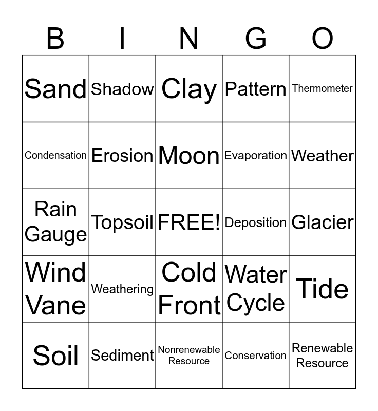 This bingo card has a free space and 29 words: Soil, Retain, Topsoil, Gravel, Sand, Clay, Erosion, Weathering, Deposition, Sediment, Glacier, Renewable Resource, Nonrenewable Resource, Conservation, Weather, Warm Front, Cold Front, Wind Vane, Thermometer, Rain Gauge, Water Cycle, Sun, Evaporation, Condensation, Pattern, Shadow, Tide, Moon and Moon Phase.
