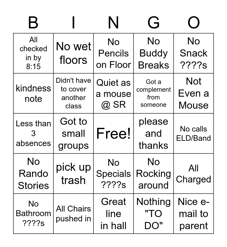This bingo card has a free space and 24 words: pick up trash, All Chairs pushed in, Quiet as a mouse @ SR, No Bathroom ????s, No Snack ????s, All checked in by 8:15, kindness note, No wet floors, please and thanks, No Specials ????s, Got a complement from someone, Less than 3 absences, No Rocking around, All Charged, Didn't have to cover another class, Nothing "TO DO", No calls ELD/Band, No Pencils on Floor, Not Even a Mouse, Got to small groups, Nice e-mail to parent, No Rando Stories, No Buddy Breaks and Great line in hall.