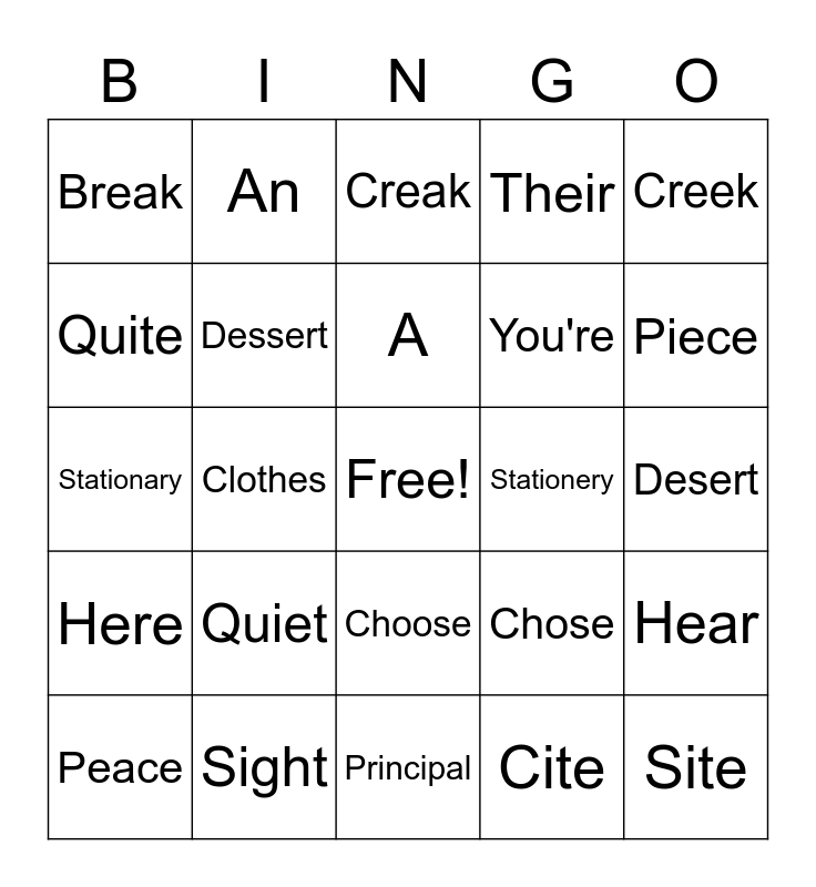 This bingo card has a free space and 24 words: Quiet, Sight, A, Peace, Creek, Break, Quite, An, Stationery, Choose, You're, Stationary, Chose, Hear, Dessert, Cite, Desert, Creak, Piece, Clothes, Site, Here, Their and Principal.