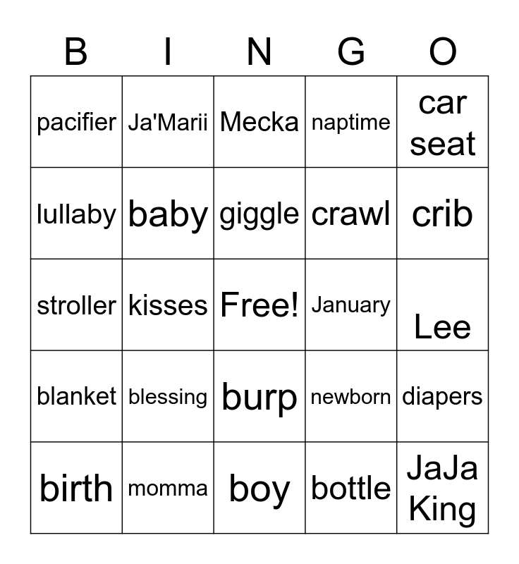 This bingo card has a free space and 24 words: blessing, momma, giggle, birth, car seat, pacifier, lullaby, Ja'Marii, January, burp, crawl, stroller, newborn, diapers, baby, bottle, Lee, Mecka, crib, kisses, JaJa King, blanket, naptime and boy.