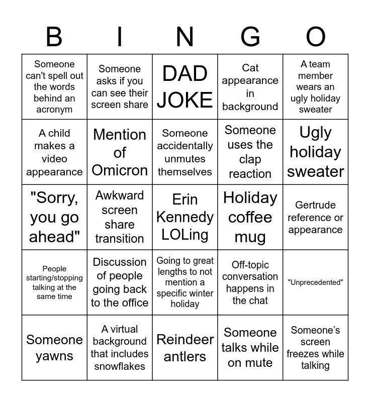 This bingo card has 26 words: Going to great lengths to not mention a specific winter holiday, Someone talks while on mute, Someone accidentally unmutes themselves, A virtual background that includes snowflakes, A team member wears an ugly holiday sweater, Someone can't spell out the words behind an acronym, A child makes a video appearance, Someone asks if you can see their screen share, Gertrude reference or appearance, Off-topic conversation happens in the chat, Someone uses the clap reaction, "Sorry, you go ahead", "Unprecedented", Someone yawns, Awkward screen share transition, Dog appearance in background, Cat appearance in background, People starting/stopping talking at the same time, DAD JOKE, Erin Kennedy LOLing, Ugly holiday sweater, Reindeer antlers, Holiday coffee mug, Discussion of people going back to the office, Mention of Omicron and Someone’s screen freezes while talking.
