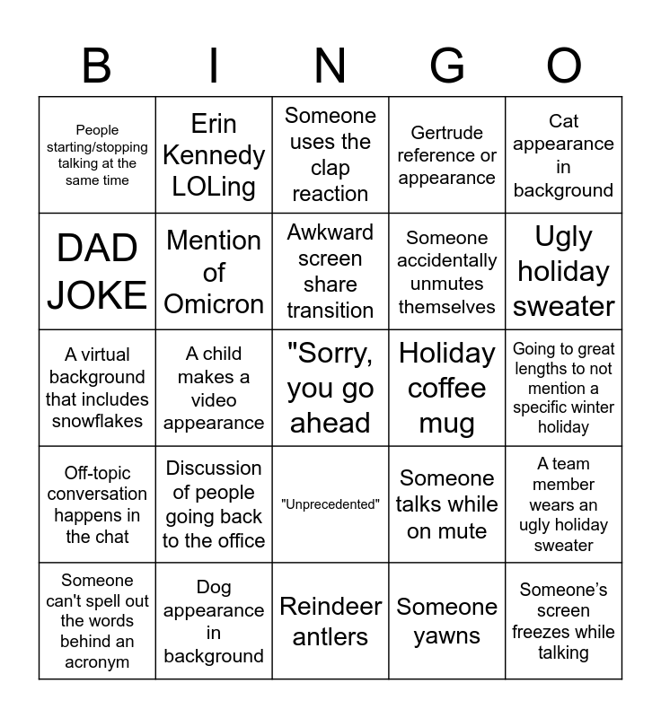 This bingo card has 26 words: "Unprecedented", Someone yawns, Awkward screen share transition, Dog appearance in background, Cat appearance in background, People starting/stopping talking at the same time, DAD JOKE, Erin Kennedy LOLing, Going to great lengths to not mention a specific winter holiday, Someone talks while on mute, Someone accidentally unmutes themselves, A virtual background that includes snowflakes, A team member wears an ugly holiday sweater, Someone can't spell out the words behind an acronym, A child makes a video appearance, Someone asks if you can see their screen share, Gertrude reference or appearance, Off-topic conversation happens in the chat, Someone uses the clap reaction, "Sorry, you go ahead, Ugly holiday sweater, Reindeer antlers, Holiday coffee mug, Discussion of people going back to the office, Mention of Omicron and Someone’s screen freezes while talking.