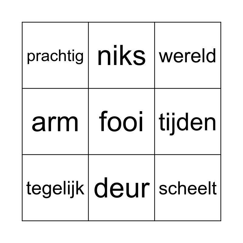 This bingo card has 20 words: miljoen, grappen, wereld, verzoekjes, jongens, fooi, rondje, prachtig, scheelt, niks, bedrag, vrienden, tijden, twintig, tegelijk, jassen, deur, arm, centen and schat.