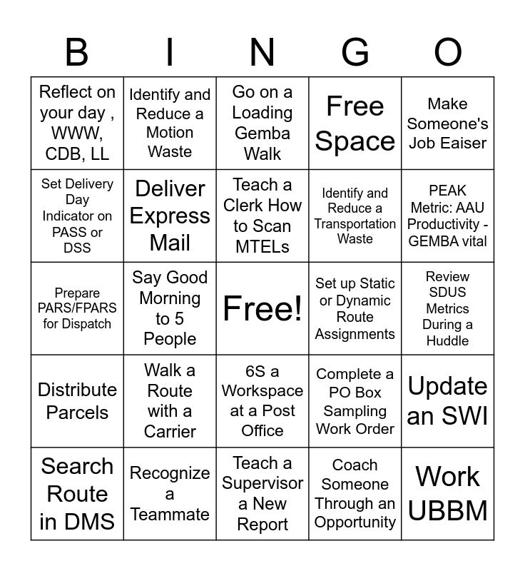 This bingo card has a free space and 69 words: identify and Reduce an Overprocessing Waste, Review SDUS Metrics During a Huddle, Ask How Someone's Day is Going, Create a Helpful Visual, Recognize a Teammate, Attend an Operational Huddle, Free Space, First-class Hero profile, Make Someone's Job Eaiser, Go on a Flow Gemba Walk, Update an SWI, Identify and Reduce a Defect Waste, Reflect on your day , WWW, CDB, LL, Go on a Loading Gemba Walk, Facilitate a Teachback on a Topic/Project, Say Good Morning to 5 People, 6S a Workspace at a Post Office, Identify and Reduce a Transportation Waste, Help an Office Create a FIRM sheet, Distribute Parcels, Set up Static or Dynamic Route Assignments, Complete a PO Box Sampling Work Order, PEAK Metric: AAU Productivity - GEMBA vital, PEAK Metric: Office Variance - GEMBA vital, Observe Loading - Identify 5 Opportunities for Improvement, Enter a MAQ, Check out Peak Processing Annex, Implement LMD Standard Placards for an Office, Coach Someone Through an Opportunity, Identify and Reduce an Inventory Waste, Identify and Reduce a Motion Waste, Do a Safety Gemba Walk, Practice Active Listening to a Customer's Pain, Say "Thank You" to 5 People, Make a Safety Observation, Utilize a New Continuous Improvement Tool, Case Mail for a Route, Distribute PO Box Mail, Set Delivery Day Indicator on PASS or DSS, Enter Hazard Warning in RIMS, Walk a Route with a Carrier, Work UBBM, Work PRS Mail, Set Up and Placard Dispatch Containers, Deliver Parcels for Day, Search Route in DMS, Lobby Assistance, Work RFS Parcels, Complete an On Street Sampling Work Order, Deliver Express Mail, Teach a Clerk How to Scan MTELs, Identify a Pain for a Clerk and Fix it with Them, Teach a Clerk a New Skillset, Teach a Supervisor a New Report, Give Carriers Expectations for the Day, Retrieve a Package for a Customer Waiting in the Lobby, Identify a Pain for a Retail Clerk and Fix it with Them, Facilitate a Huddle with the Retail Clerks, Backdoor Management in an Office, Prepare PARS/FPARS for Dispatch, Complete Sampling Work Order, PEAK Metric: Parcel Select - Deep Dive vitals EDW (root cause analysis), PEAK Metric: Priority 1Day - Deep Dive vitals EDW (root cause analysis), Enter a PAQ, Conduct a Plant Dock Audit Monitoring Arrival Quaility, Replace Supplies in a POS, Review RDC Separations, Gemba Walk at a Plant Following Dispatches from the Delivery Unit and 6S a Retail Lobby.