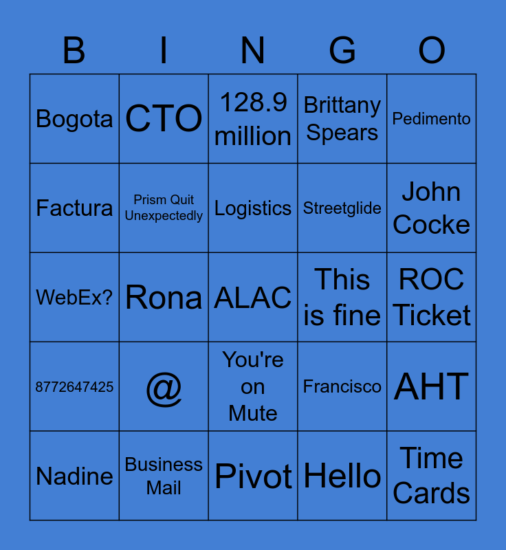 This bingo card has a free space and 39 words: Danfe, Corey's Bedroom, Payday, Prism Quit Unexpectedly, Nadine, You're on Mute, Logistics, Julio, Pedimento, 8772647425, Rona, Brittany Spears, Time Cards, ROC Ticket, This is fine, @, Back to Back Champs, Bogota, Work from Home, Francisco, Factura, Pivot, Streetglide, John Cocke, SI, Coffee, Bom Dia, We are Live!, Buenos dias, CTO, Chorus, 212.6 million, 128.9 million, Business Mail, Hello, Costco, AHT, WebEx? and Slack.