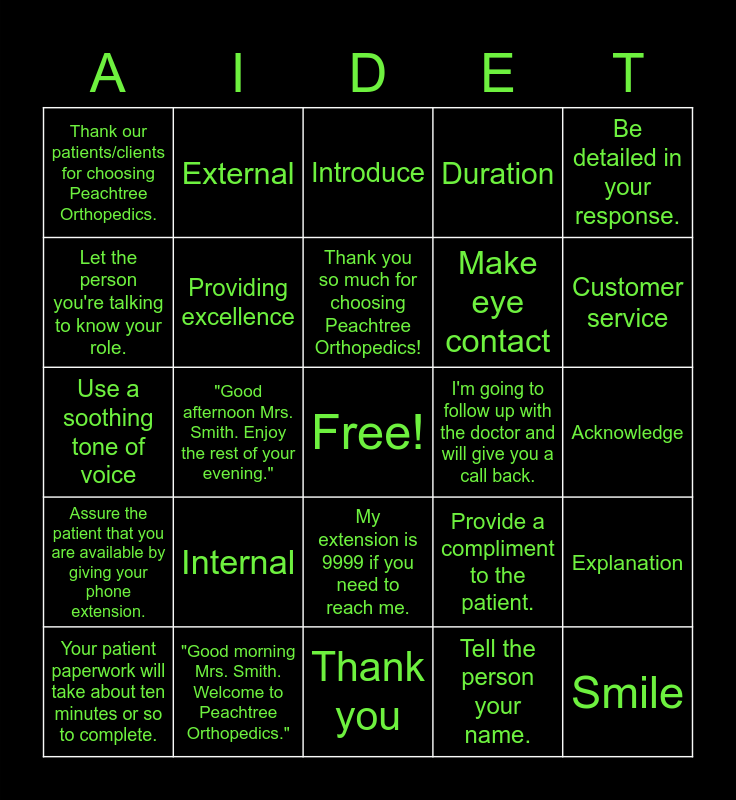 This bingo card has a free space and 24 words: Internal, "Good morning Mrs. Smith. Welcome to Peachtree Orthopedics.", Thank you so much for choosing Peachtree Orthopedics!, Your patient paperwork will take about ten minutes or so to complete., Be detailed in your response., Thank our patients/clients for choosing Peachtree Orthopedics., Let the person you're talking to know your role., External, I'm going to follow up with the doctor and will give you a call back., My extension is 9999 if you need to reach me., Make eye contact, Use a soothing tone of voice, Provide a compliment to the patient., Explanation, Providing excellence, Tell the person your name., Acknowledge, Introduce, Customer service, "Good afternoon Mrs. Smith. Enjoy the rest of your evening.", Smile, Assure the patient that you are available by giving your phone extension., Duration and Thank you.