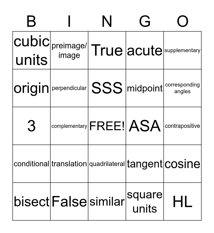 This bingo card has a free space and 52 words: vertical angles, HL, dilation, similar, translation, reflection, preimage/ image, rotation, origin, parallel, perpendicular, sine, cosine, tangent, SAS, AAS, SSS, ASA, reflexive property, supplementary, complementary, square units, cubic units, midpoint, collinear, base angles, alternate exterior angles, alternate interior angles, corresponding angles, scale factor, scalene, acute, equilateral, 180 degrees, 4 times, True, False, 8 times, v+f = e + 2, converse, inverse, contrapositive, conditional, rhombus, quadrilateral, polygon, trapezoid, 3, pentagon, octagon, bisect and hexagon.