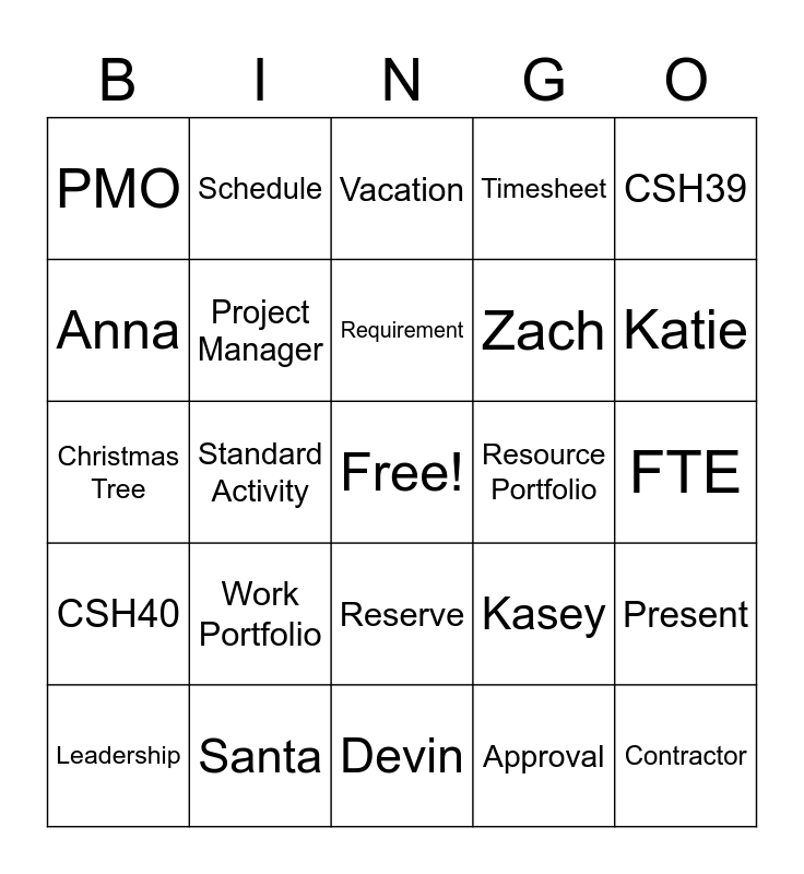 This bingo card has a free space and 39 words: Allocation, Utilization, Resource Manager, Project Manager, Leadership, Reserve, Requirement, RMA, CSH39, CSH40, Standard Activity, Timesheet, Contractor, FTE, Resource Portfolio, Work Portfolio, Intake, PMO, Trevor, Kasey, Anna, Devin, Zach, Katie, Columnset, Role, Specialty, Service Line, Teams, Schedule, Snowman, Holiday, Vacation, Santa, Approval, Request, Present, Christmas Tree and Family.