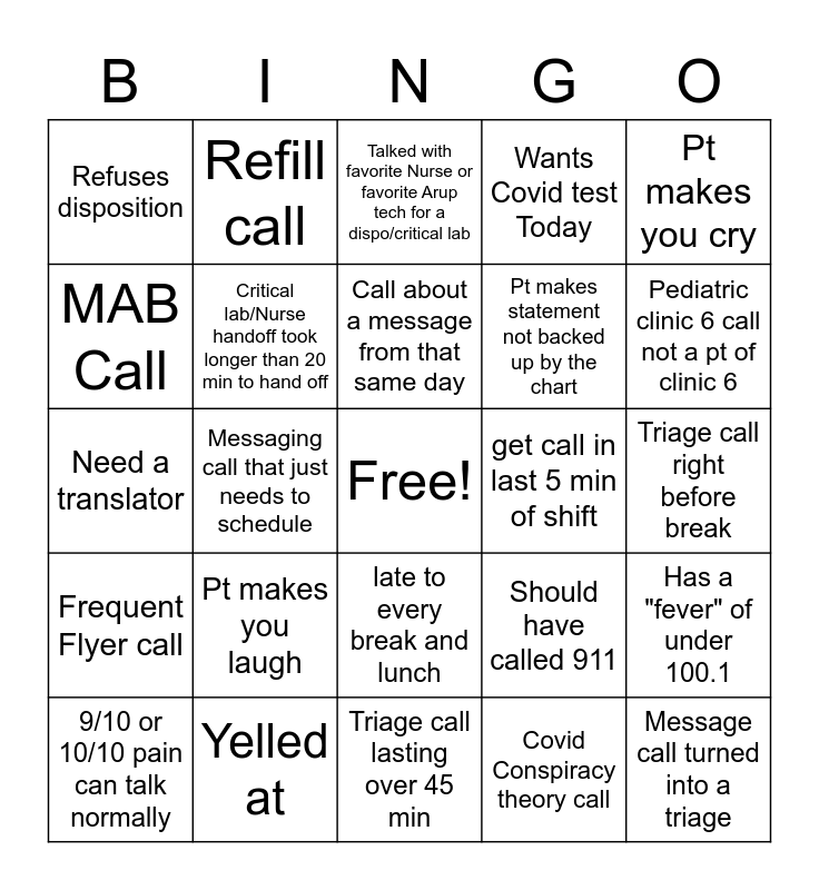 This bingo card has a free space and 30 words: Yelled at, Urgent medication refill on Friday afternoon, Messaging call that just needs to schedule, vaccine symptom line for covid symptoms, Refuses disposition, Talked with favorite Nurse or favorite Arup tech for a dispo/critical lab, Critical lab/Nurse handoff took longer than 20 min to hand off, late to every break and lunch, get call in last 5 min of shift, Triage call lasting over 45 min, Triage call right before break, Message call turned into a triage, Covid Conspiracy theory call, Vaccination question, Pediatric clinic 6 call not a pt of clinic 6, Use wrong greeting, Should have called 911, Frequent Flyer call, Pt makes you laugh, Pt makes you cry, Need a translator, Want information from different health care facility, Refill call, Pt makes statement not backed up by the chart, MAB Call, Wants Covid test Today, Has a "fever" of under 100.1, 9/10 or 10/10 pain can talk normally, Call about a message from that same day and Working in PJs.