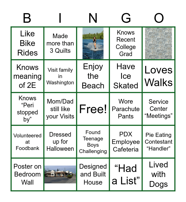 This bingo card has 5 images, a free space and 25 words: Like Bike Rides, Visit family in Washington, Enjoy the Beach, Have Ice Skated, Lived with Dogs, Poster on Bedroom Wall, Dressed up for Halloween, “Had a List”, Retired from Port, Volunteered at Foodbank, Don’t appreciate a sister in-law, Designed and Built House, Wore Parachute Pants, Pie Eating Contestant “Handler”, Knows meaning of 2E, Mom/Dad still like your Visits, Russ, Knows Recent College Grad, Service Center “Meetings”, Knows “Peri stopped by”, Made more than 3 Quilts, Found Teenage Boys Challenging, PDX Employee Cafeteria, Loves Walks and Help with P and T Cards.