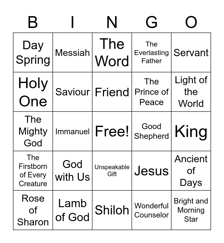 This bingo card has a free space and 25 words: God with Us, Shiloh, Friend, Rose of Sharon, Servant, Day Spring, Holy One, Messiah, Good Shepherd, Unspeakable Gift, The Prince of Peace, The Mighty God, Jesus, Ancient of Days, Saviour, Lily of the Valley, King, The Word, Light of the World, Immanuel, Bright and Morning Star, Lamb of God, The Firstborn of Every Creature, The Everlasting Father and Wonderful Counselor.