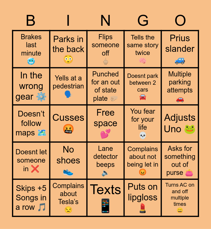 This bingo card has a free space and 24 words: No shoes π, Complains about Teslaβs π, Punched for an out of state plate π€πΌ, Skips +5 Songs in a row π΅, Prius slander π, Brakes last minute π₯Ά, In the wrong gear βοΈ, Parks in the back π³, You fear for your life π, Lane detector beeps π, Doesnt park between 2 cars π, Doesnβt follow maps πΊ, Complains about not being let in π‘, Asks for something out of purse π, Yells at a pedestrian π£, Puts on lipgloss π, Adjusts Uno πΈ, Flips someone off ππΌ, Multiple parking attempts π, Cusses π€¬, Turns AC on and off multiple times π, Doesnt let someone in β, Tells the same story twice π§ and Texts π±.