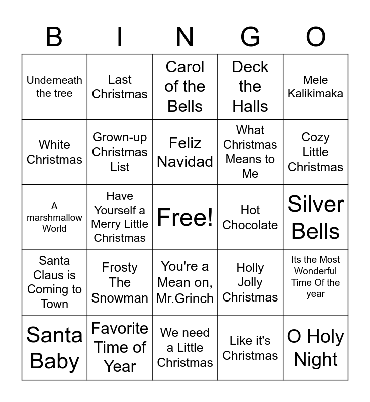 This bingo card has a free space and 64 words: Rockin' Around The Christmas Tree, Christmas (Baby Please Come Home), All I Want For Christmas Is You, Its the Most Wonderful Time Of the year, Sleigh Ride, Let it Snow Let it Snow!, Last Christmas, Rudolph the Red-Nosed Reindeer, Feliz Navidad, Here comes Santa Claus, You're a Mean on, Mr.Grinch, Winter Wonderland, Silver Bells, Mele Kalikimaka, Blue Christmas, White Christmas, Have Yourself a Merry Little Christmas, Underneath the tree, Silent Night, What Christmas Means to Me, Frosty The Snowman, Santa Claus is Coming to Town, Deck the Halls, There's no place like home for the Holidays, Little Saint Nick, I'll Be Home For Christmas, Baby, It's Cold Outside, I saw Mommy Kissing Santa Claus, Santa Tell Me, The First Noel, Joy to The World, Jingle Bells, Hallelujah, The Christmas Song, Cozy Little Christmas, Santa Baby, Where are you Christmas, Like it's Christmas, Candy Cane Lane, Grown-up Christmas List, A marshmallow World, Hot Chocolate, When Christmas Comes to Town, Believe, Do you Hear What I Hear?, O Holy Night, Favorite Time of Year, Under The Mistletoe, Holly Jolly Christmas, Linus and Lucy, It's Beginning to look a like Christmas, Jingle Bell Rock, We need a Little Christmas, The Twelve Days Of Christmas, Happy xmas (War is over), Little Drummer Boy, Carol of the Bells, O Come, All Ye Faithful, Hark! the Herald Sing, Mistletoe, The Chipmunk Song, Up on The Housetop, My Favorite Things and The Christmas Waltz.
