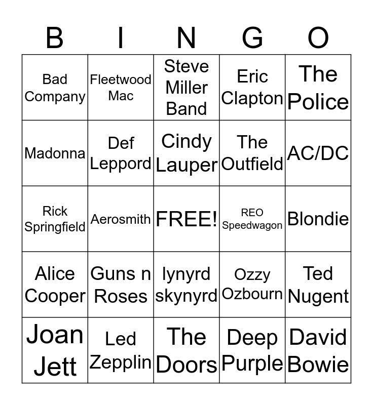 This bingo card has a free space and 24 words: Guns n Roses, Led Zepplin, Cindy Lauper, Joan Jett, The Police, Bad Company, Madonna, Fleetwood Mac, REO Speedwagon, lynyrd skynyrd, The Outfield, Rick Springfield, Ozzy Ozbourn, Ted Nugent, Def Leppord, Deep Purple, Blondie, Steve Miller Band, AC/DC, Aerosmith, David Bowie, Alice Cooper, Eric Clapton and The Doors.