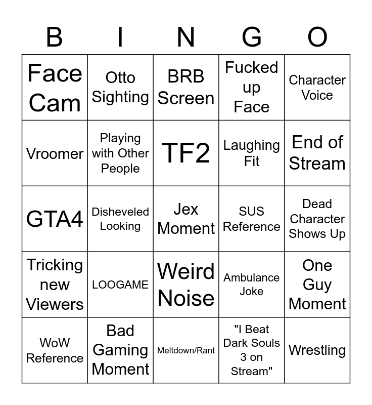 This bingo card has 25 words: LOOGAME, Meltdown/Rant, TF2, WoW Reference, Character Voice, Face Cam, Vroomer, Otto Sighting, SUS Reference, Weird Noise, Laughing Fit, GTA4, Ambulance Joke, One Guy Moment, Playing with Other People, Wrestling, Dead Character Shows Up, BRB Screen, End of Stream, Disheveled Looking, Jex Moment, Bad Gaming Moment, Tricking new Viewers, Fucked up Face and "I Beat Dark Souls 3 on Stream".