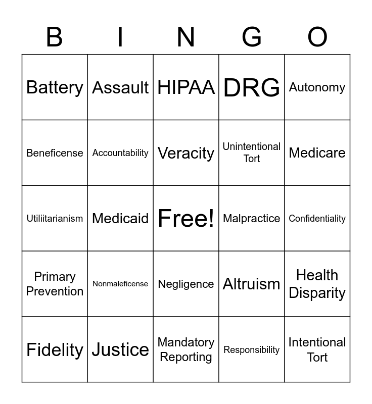 This bingo card has a free space and 24 words: Nonmaleficense, Justice, Veracity, Fidelity, Autonomy, Battery, Beneficense, Assault, Malpractice, Negligence, Unintentional Tort, Utiliitarianism, Altruism, Health Disparity, Accountability, Responsibility, Confidentiality, HIPAA, Medicare, Medicaid, Intentional Tort, Primary Prevention, DRG and Mandatory Reporting.