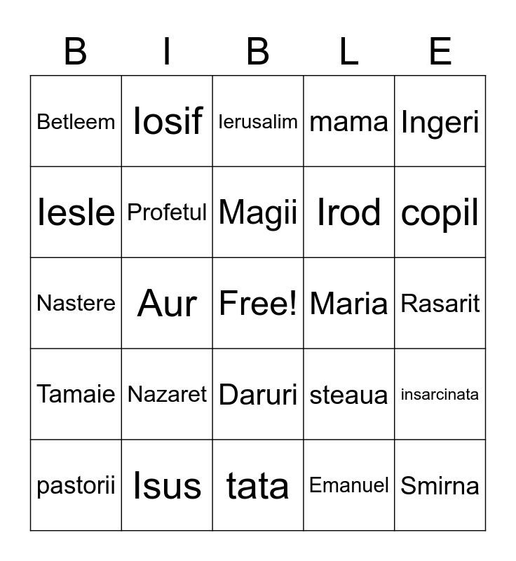 This bingo card has a free space and 24 words: Nazaret, Isus, Magii, pastorii, Ingeri, Betleem, Iesle, Iosif, Maria, Daruri, Irod, Nastere, steaua, insarcinata, Profetul, Emanuel, Rasarit, Ierusalim, copil, Aur, Smirna, Tamaie, mama and tata.