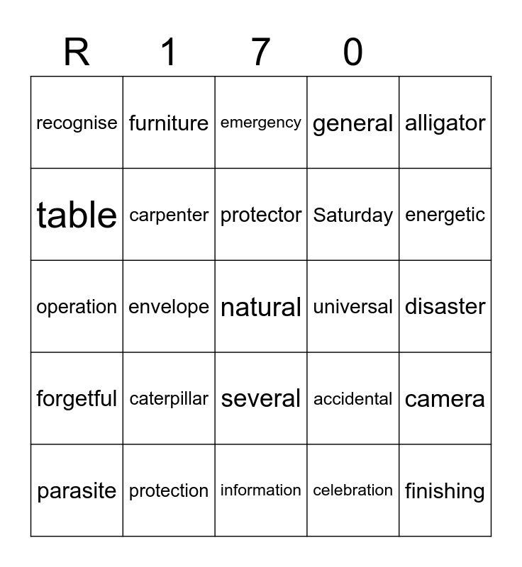 This bingo card has a free space and 24 words: caterpillar, protection, protector, parasite, alligator, recognise, table, furniture, universal, several, Saturday, operation, accidental, camera, carpenter, celebration, disaster, emergency, energetic, envelope, finishing, forgetful, general and information.