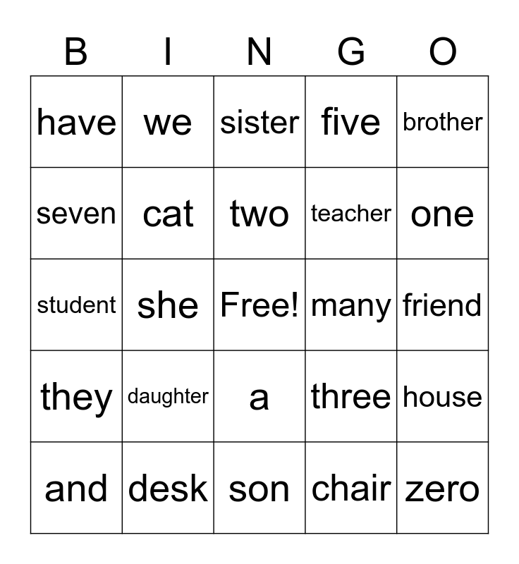 This bingo card has a free space and 24 words: daughter, desk, two, and, brother, have, seven, we, many, a, teacher, student, three, house, cat, chair, friend, sister, one, she, zero, they, five and son.