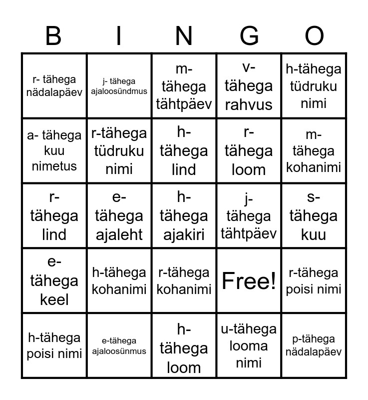 This bingo card has 25 words: h-tähega kohanimi, h-tähega loom, h-tähega lind, h-tähega poisi nimi, h-tähega tüdruku nimi, r- tähega nädalapäev, a- tähega kuu nimetus, j- tähega ajaloosündmus, j- tähega tähtpäev, r-tähega kohanimi, r-tähega loom, r-tähega lind, Free!, r-tähega poisi nimi, r-tähega tüdruku nimi, p-tähega nädalapäev, s-tähega kuu, m-tähega tähtpäev, m-tähega kohanimi, e-tähega ajaleht, h-tähega ajakiri, e-tähega ajaloosünmus, e-tähega keel, v-tähega rahvus and u-tähega looma nimi.