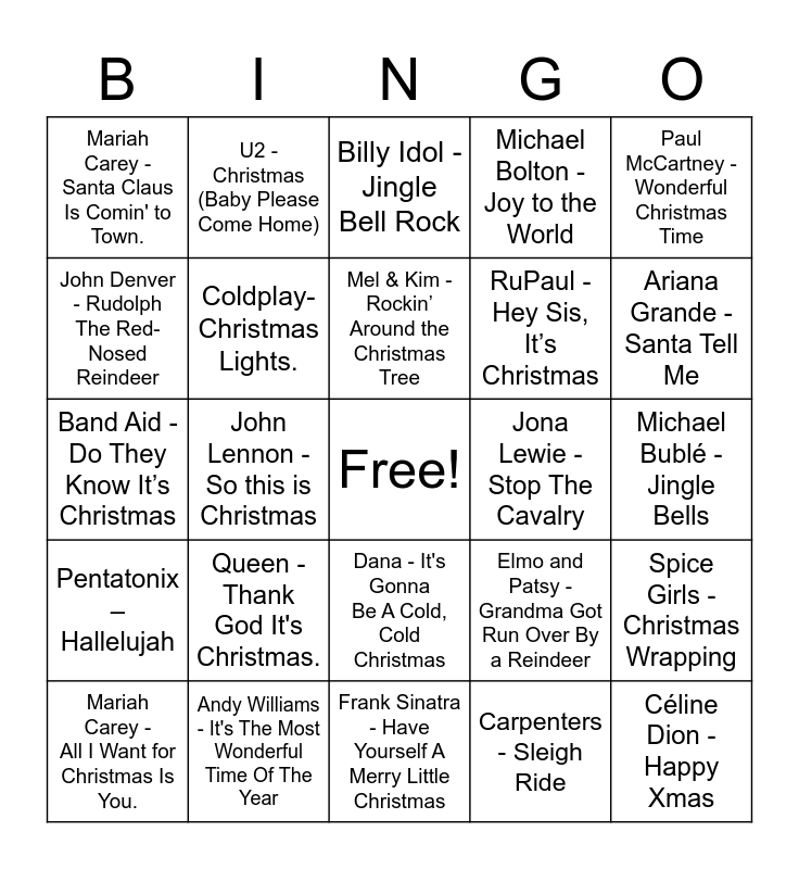 This bingo card has a free space and 29 words: Mariah Carey - All I Want for Christmas Is You., Wham! – Last Christmas, John Lennon - So this is Christmas, Chris Rea – Driving Home For Christmas., Mariah Carey - Santa Claus Is Comin' to Town., Billy Idol - Jingle Bell Rock, Coldplay- Christmas Lights., Queen - Thank God It's Christmas., Jona Lewie - Stop The Cavalry, Andy Williams - It's The Most Wonderful Time Of The Year, Michael Bublé - Jingle Bells, Céline Dion - Happy Xmas, Frank Sinatra - Have Yourself A Merry Little Christmas, Carpenters - Sleigh Ride, Ariana Grande - Santa Tell Me, Miss Montreal - Being Alone At Christmas, Dana - It's Gonna Be A Cold, Cold Christmas, Pentatonix – Hallelujah, Paul McCartney - Wonderful Christmas Time, Band Aid - Do They Know It’s Christmas, Elmo and Patsy - Grandma Got Run Over By a Reindeer, Christina Aguilera - Merry Christmas, Baby, RuPaul - Hey Sis, It’s Christmas, John Denver - Rudolph The Red-Nosed Reindeer, Michael Bolton - Joy to the World, U2 - Christmas (Baby Please Come Home), Spice Girls - Christmas Wrapping, Mel & Kim - Rockin’ Around the Christmas Tree and Elvis Presley - Here Comes Santa Claus.