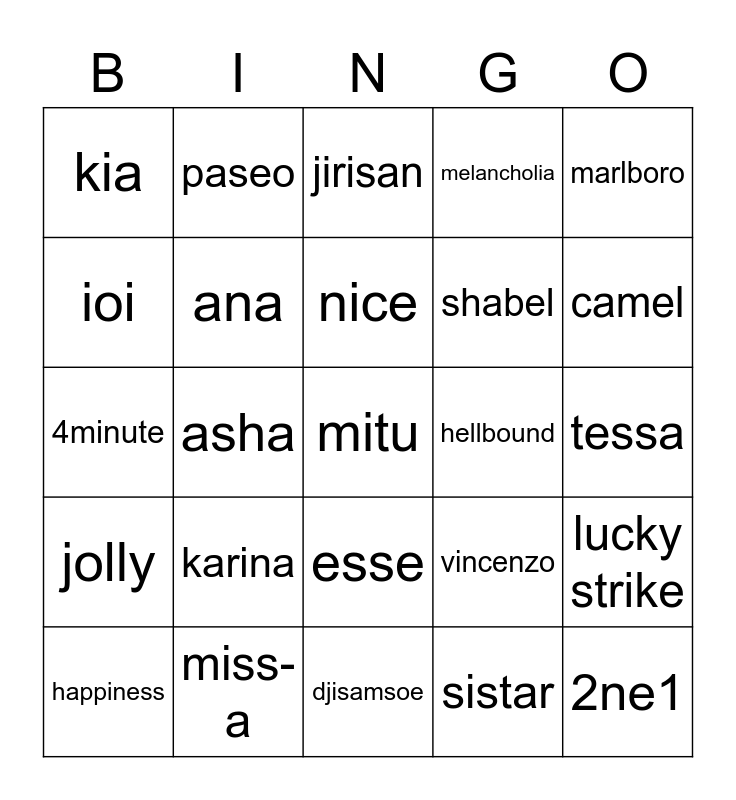 This bingo card has a free space and 24 words: karina, miss-a, nice, happiness, marlboro, kia, ioi, paseo, hellbound, esse, shabel, 4minute, vincenzo, lucky strike, ana, sistar, tessa, jirisan, camel, asha, 2ne1, jolly, melancholia and djisamsoe.