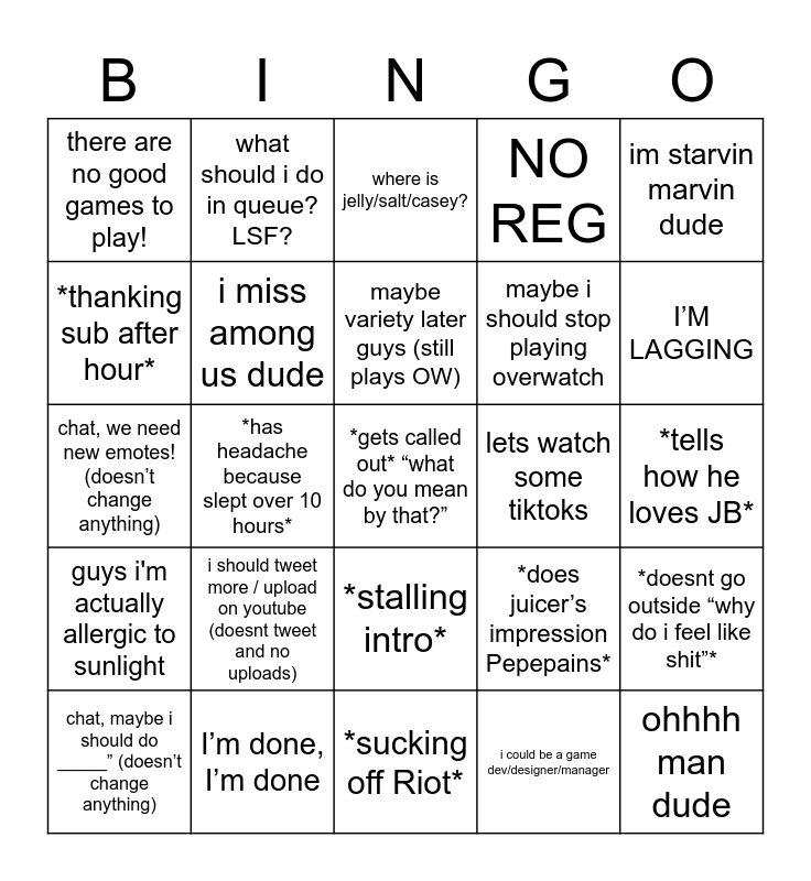 This bingo card has a free space and 24 words: chat, maybe i should do _____” (doesn’t change anything), i should tweet more / upload on youtube (doesnt tweet and no uploads), maybe variety later guys (still plays OW), i could be a game dev/designer/manager, im starvin marvin dude, there are no good games to play!, what should i do in queue? LSF?, where is jelly/salt/casey?, lets watch some tiktoks, *tells how he loves JB*, chat, we need new emotes! (doesn’t change anything), i miss among us dude, *does juicer’s impression Pepepains*, *doesnt go outside “why do i feel like shit”*, *thanking sub after hour*, I’m done, I’m done, *sucking off Riot*, NO REG, I’M LAGGING, guys i'm actually allergic to sunlight, *has headache because slept over 10 hours*, *stalling intro*, maybe i should stop playing overwatch and ohhhh man dude.