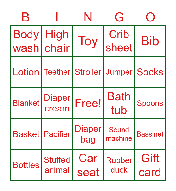 This bingo card has a free space and 25 words: Pacifier, Car seat, Stroller, Bottles, Bib, Body wash, Lotion, High chair, Bath tub, Diaper bag, Jumper, Blanket, Sound machine, Bassinet, Teether, Thermometer, Spoons, Toy, Socks, Diaper cream, Gift card, Stuffed animal, Basket, Crib sheet and Rubber duck.