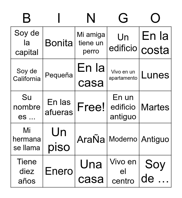 This bingo card has a free space and 50 words: Me llamo ..., Soy de …, Vivo en …, Una casa, Un piso, Un apartamento, Bonita, Fea, Soy de California, Grande, Pequeña, Un edificio, Antiguo, Moderno, En el centro, En las afueras, En la casa, En un edificio antiguo, En un edificio moderno, En la costa, En las afueras, Vivo en el centro, Soy de la capital, Vivo en un apartamento, Mi amiga, Tengo ocho años., Lunes, Octubre, Mi amiga tiene un perro, AraÑa, Viernes, Rojo, Pelo, Cuaderno, Enero, Febrero, Marzo, Junio, June, Martes, Miércoles, Tengo el pelo rizado, Tengo los ojos marrones, Tengo barba, Tiene diez años, Su nombre es ..., Sábado, Domingo, Mi hermana se llama and Mi hermano se llama.