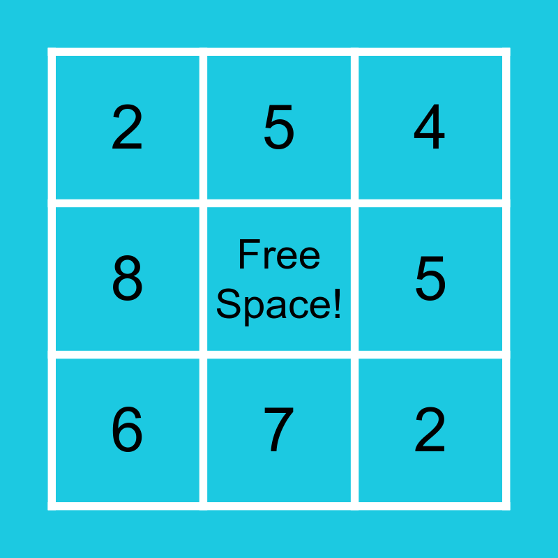 This bingo card has 14 words: 3, 7, 5, 8, Free Space!, 4, 9, 10, 2, 2, 4, 6, 5 and 4.