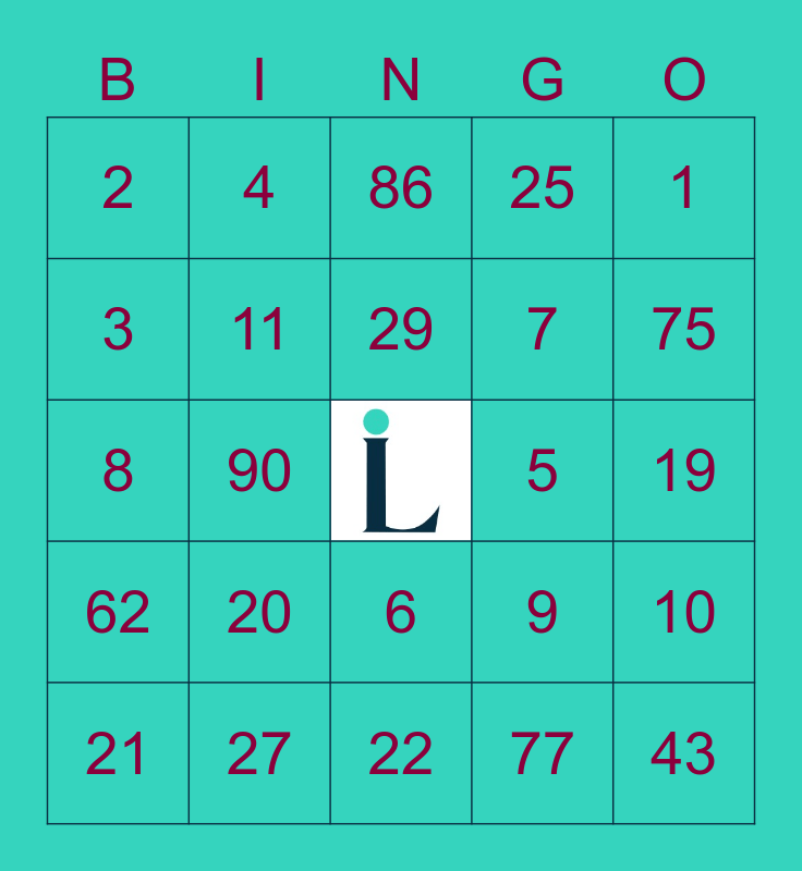This bingo card has a free space and 25 words: 20, 22, 29, 21, 1, 2, 3, 4, 5, 6, 7, 8, 9, 10, 11, 12, 19, 86, 75, 90, 43, 27, 62, 25 and 77.