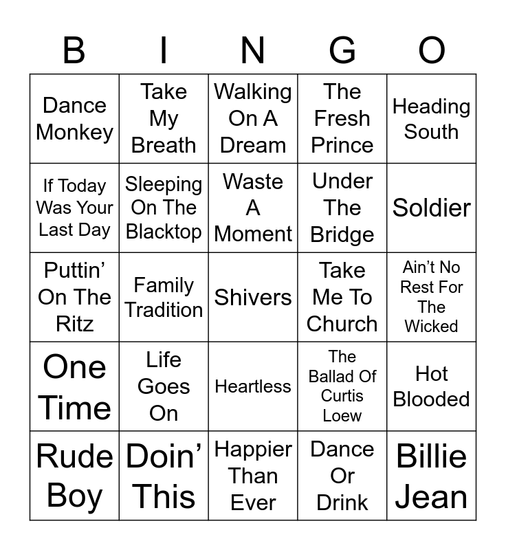 This bingo card has 49 words: I Knew You Were Trouble, Shivers, Can I Get It, Happier Than Ever, Life Goes On, Bad Romance, Take My Breath, Shoot To Thrill, If Today Was Your Last Day, The Man Comes Around, Sleeping On The Blacktop, The Fresh Prince, Hot Blooded, The Ballad Of Curtis Loew, Welcome To The Jungle, Ophelia, Waste A Moment, Take Me To Church, Spin You Around, Heading South, Family Tradition, Dance Or Drink, Dance Monkey, Under The Bridge, Sold, Soldier, Rude Boy, Right Round, Heartless, One Time, I Found A Way, Problem, Sexy Can I, Ironic, Doin’ This, I Want To Hold Your Hand, Feel Good Inc., Paradise, Ain’t No Rest For The Wicked, Say It Ain’t So, Beverly Hills, 9 To 5, Billie Jean, Break My Stride, Puttin’ On The Ritz, Walking On A Dream, Lonely If You Are, Blurred Lines and That’s What I Like.