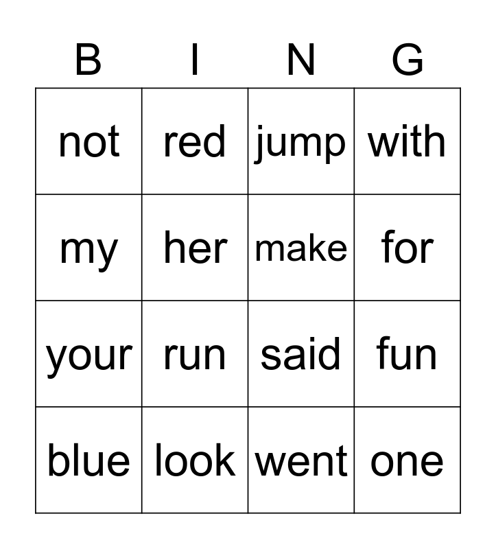 This bingo card has 20 words: fun, here, jump, we, blue, my, look, not, your, red, run, said, her, one, make, two, for, with, went and class.