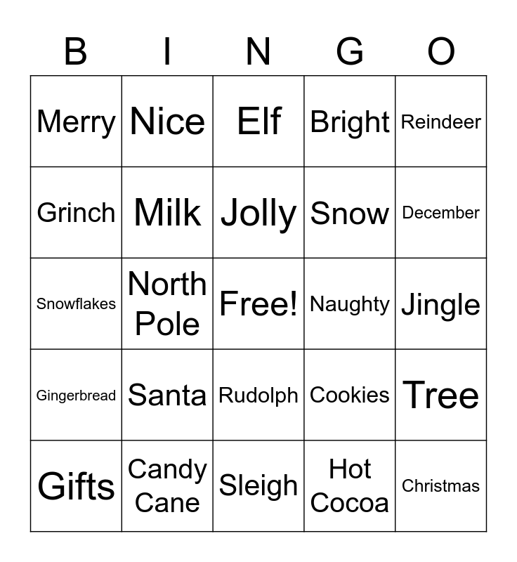 This bingo card has a free space and 24 words: Gifts, Santa, Jolly, Hot Cocoa, Reindeer, Merry, Nice, Elf, Naughty, Jingle, Snowflakes, Milk, Cookies, Tree, Grinch, Candy Cane, Sleigh, Bright, December, Gingerbread, North Pole, Rudolph, Snow and Christmas.