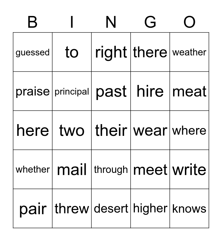 This bingo card has 40 words: principle, here, hear, principal, threw, through, past, passed, weather, whether, two, there, their, where, wear, mail, male, guessed, guest, right, write, higher, hire, praise, prays, wait, weight, nose, knows, plain, plane, pair, pear, meet, meat, desert, dessert, they're, to and too.
