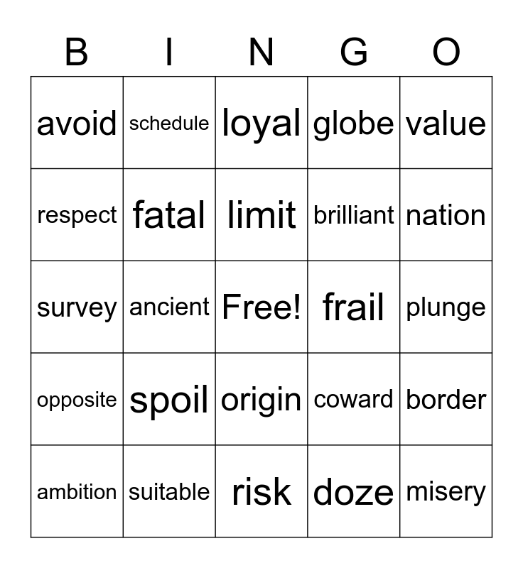 This bingo card has a free space and 29 words: ambition, brief, ancient, cling, avoid, loyal, fatal, spoil, frail, suitable, plunge, misery, risk, doze, nation, woe, origin, opposite, value, survey, coward, confess, brilliant, respect, globe, schedule, border, limit and sensitive.