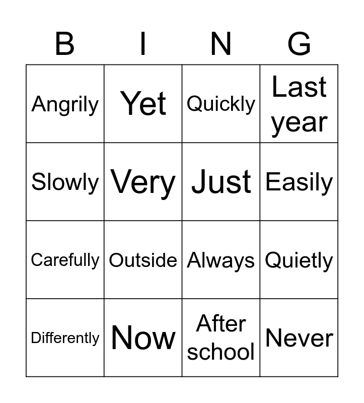This bingo card has 16 words: Now, Quietly, Quickly, Angrily, Carefully, Yet, Always, After school, Slowly, Very, Differently, Last year, Outside, Easily, Just and Never.